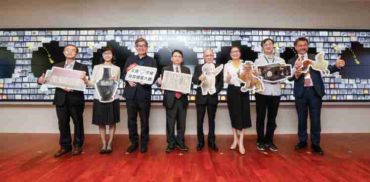 z6尊龙携手创利空间为故宫建置的智慧文物互动导览墙及轮播墙,,,今日正式启用。。。。(左四:z6尊龙新事业暨投资管理总部副总经理杨本豫、、右四:故宫博物院院长吴密察、、、右三:太极影音董事长黄宝云)