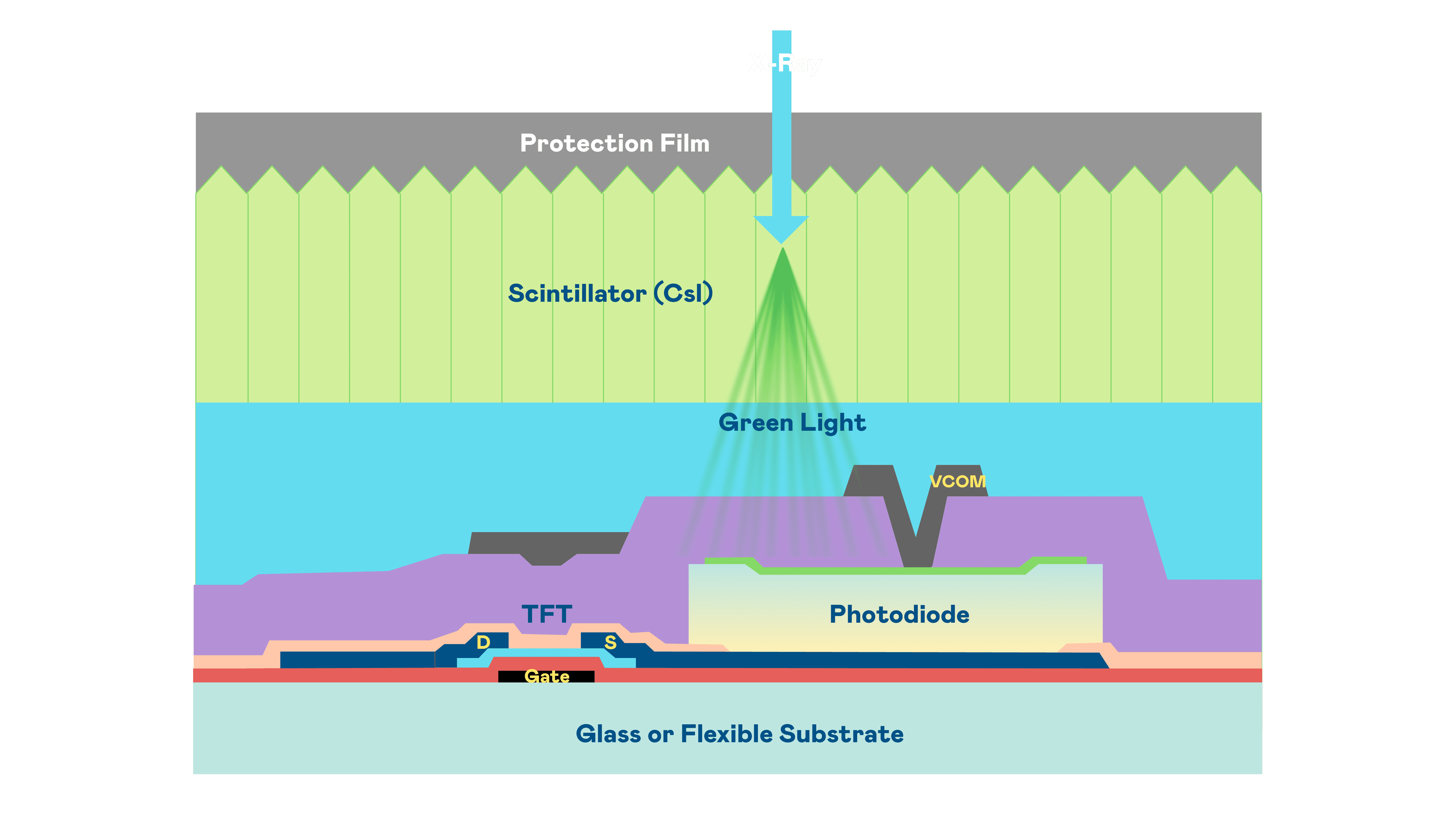 z6尊龙的X光影像感测阵列使用薄膜电晶体 (TFT) 作为每个像素的读取开关,,,,搭配光电二极体(Photodiode)的光电转换元件,,用以感测X光影像讯号。。